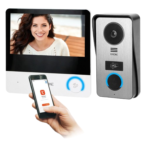 VIRONE – 4 vezetékes, 1 lakásos videokaputelefon szett, falon kívüli vandálbiztos kültéri egység esővédő kerettel, 7″ Full HD érintőképernyős beltéri monitor, elektromos zár vezérlése, beépített 125kHz RFID olvasó, rögzítéshez microSD kártya foglalat, Wi-Fi funckió okostelefonokhoz, Tuya Smart applikáció, 6db CON-TAG kulcstartóval, kültéri egység méretei: 87x168x40mm, beltéri egység méretei: 181x181x18mm, maximum 4db beltéri egységig bővíthető, intercom funkció,